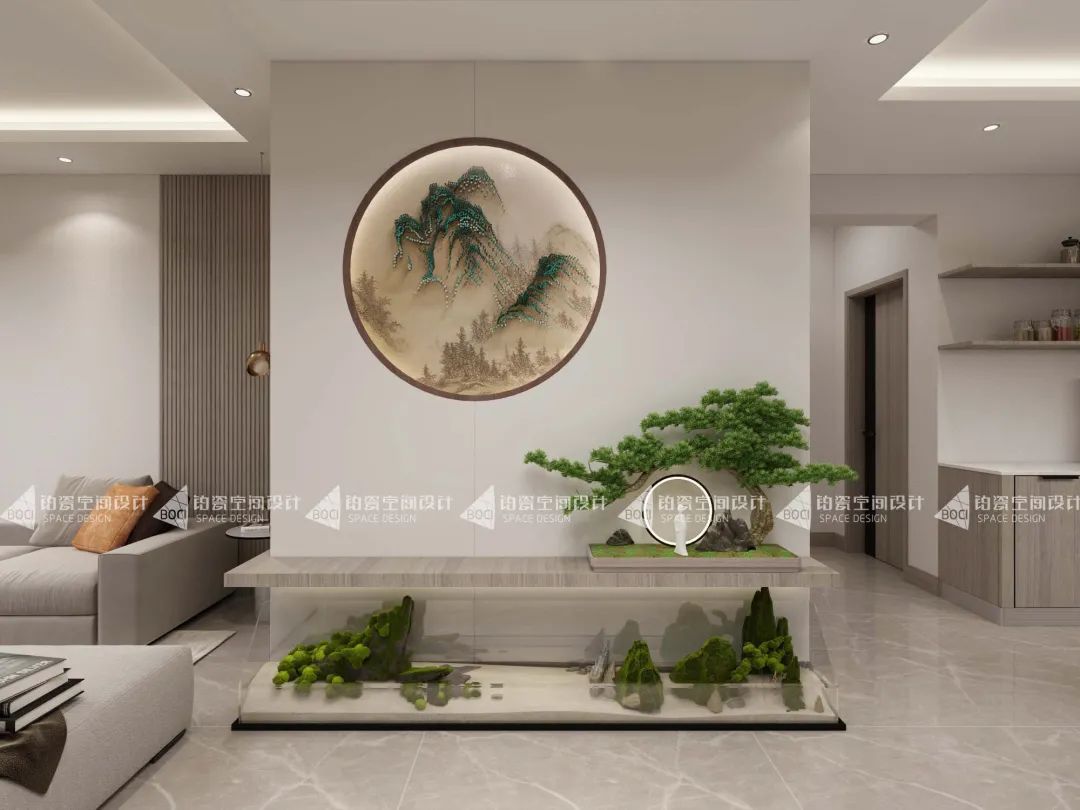 入户正对的是作为玄关照壁的景观墙,装饰模块采用面+体的空间布局:墙面嵌入的立体圆框装饰画在内嵌灯带的映衬下意境十足,与墙体下半部台面上摆放的中国风绿植在视觉投影上构成远近景互补的构图,美感十足。再配合地面景观池内的微缩山水景,整个景观区上中下、远中近构图饱满,意境深远悠长,视觉效果极佳。
