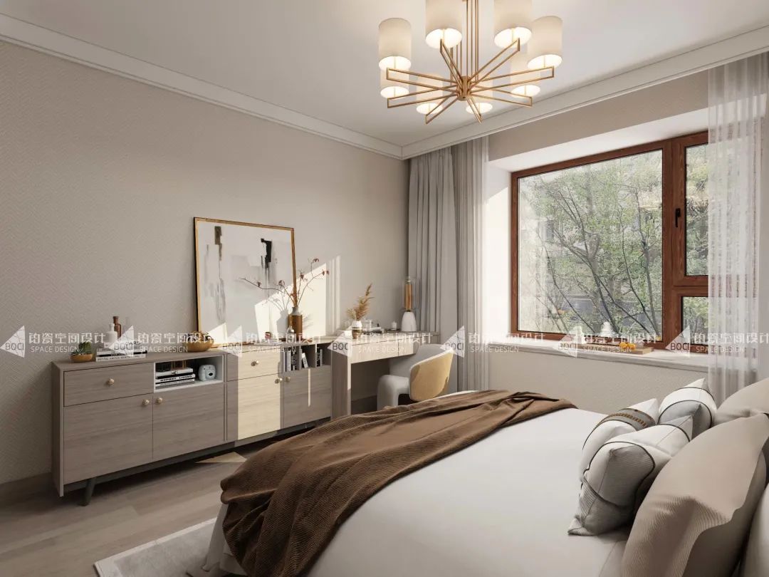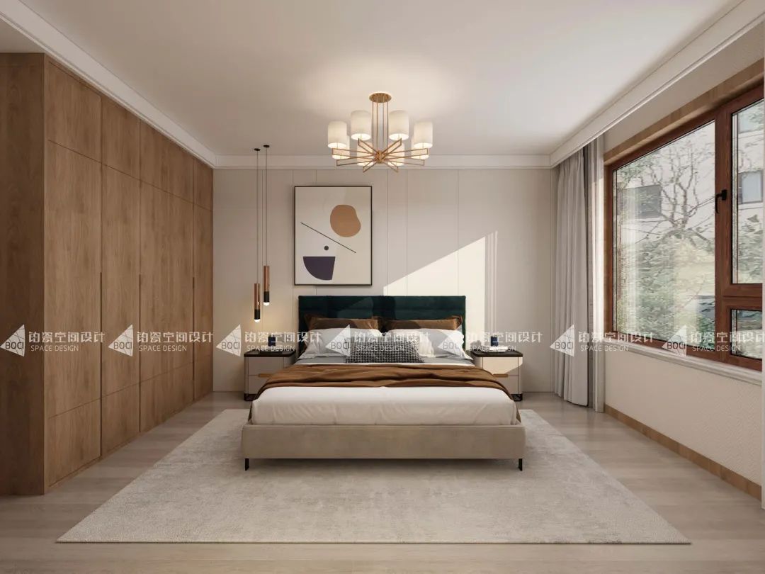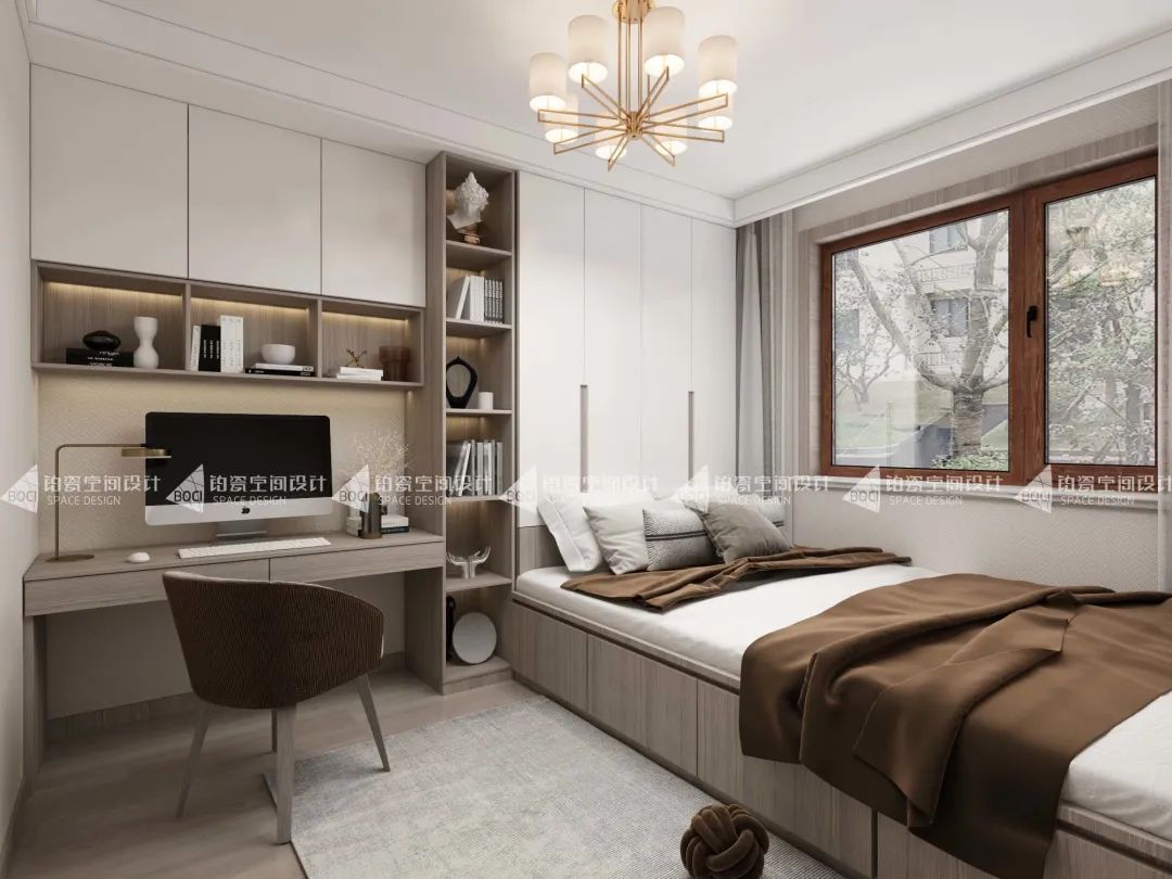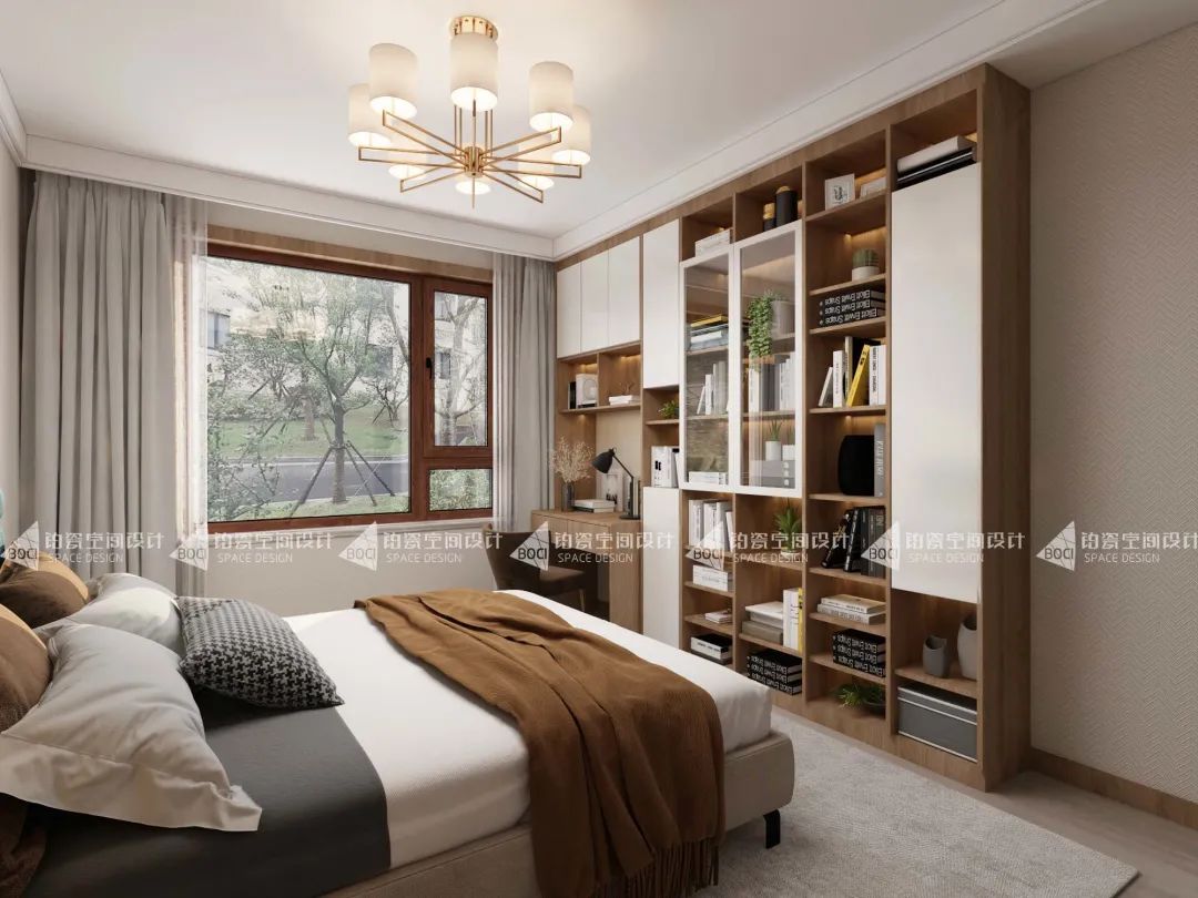 卧室空间方面,床头采用全白护墙板营造素雅简洁的氛围,使用现代风装饰挂画丰富视觉;房间一侧深原木色通顶衣柜满足了业主的储物需求。床尾处的书柜大体与公共空间风格统一,半开放式的造型丰富视觉效果的同时也满足了不同类型物品的储物需求,设计师在书柜一角设计了书桌,让业主可以在一个安静轻松的环境下工作或学习。