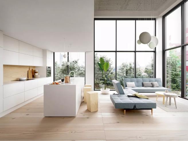 室内空间尽量保持开阔,可选择落地玻璃窗或开放式厨房,不管从哪个角度看,您的视线范围内都可以看向去很开阔。用岛台或吧台代替实墙,空间会显得更通透,尤其小户型可以参考。