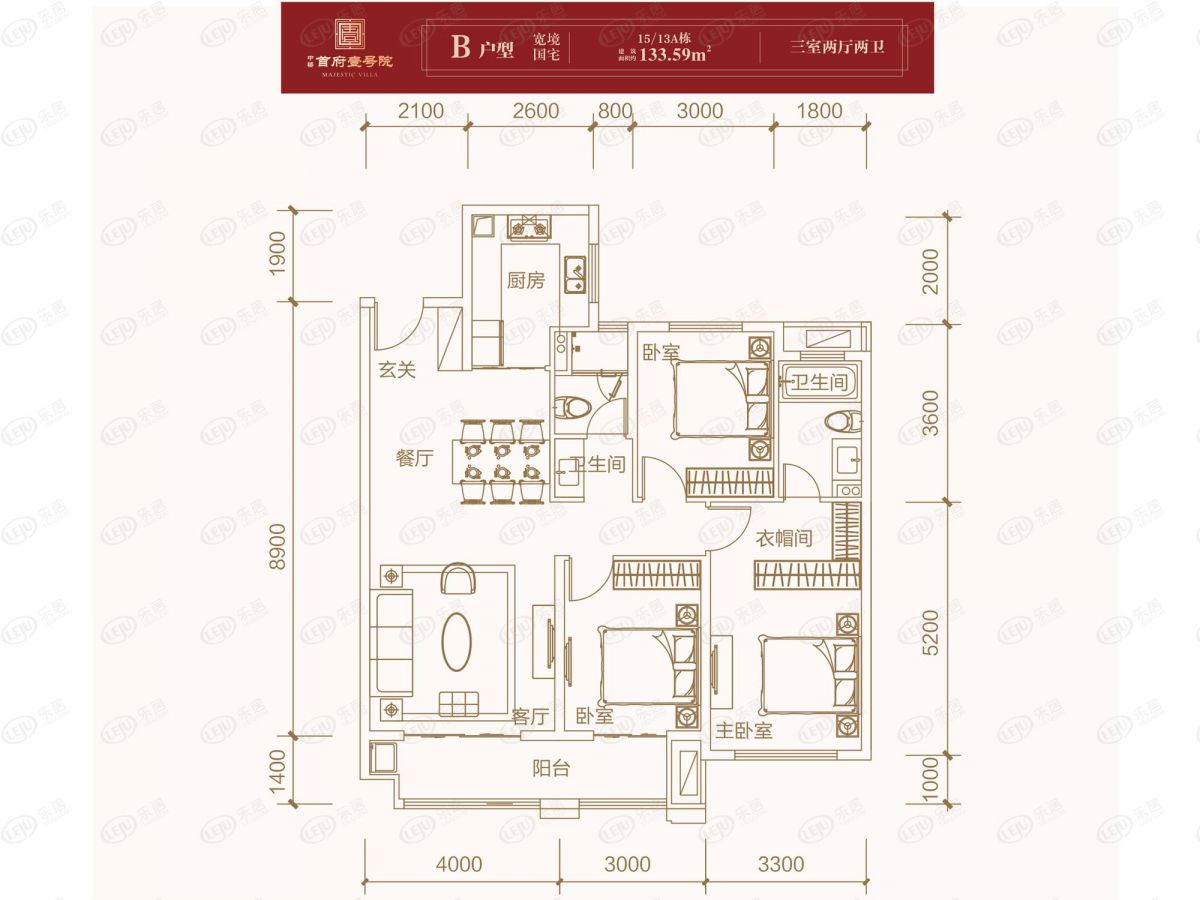 中梁·首府壹号院三室两厅两卫133.59平方米