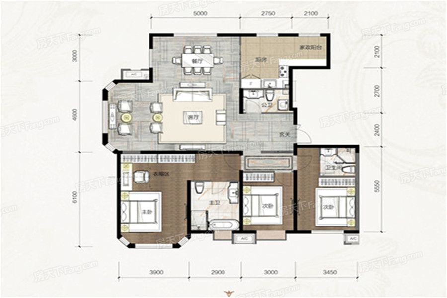 各个空间户型方正,方便室内家具布置;全明通透户型,居住舒适度较高,整个空间采光充足,利于后期居住;整体空间布局合理,能够保证动静分离和居室通风,方便使用;卧室厨卫等各个功能区的面积大小都比较合理,居住体验便利,整体舒适度高;公摊低于15%,属于目前市场中公摊很低的户型。